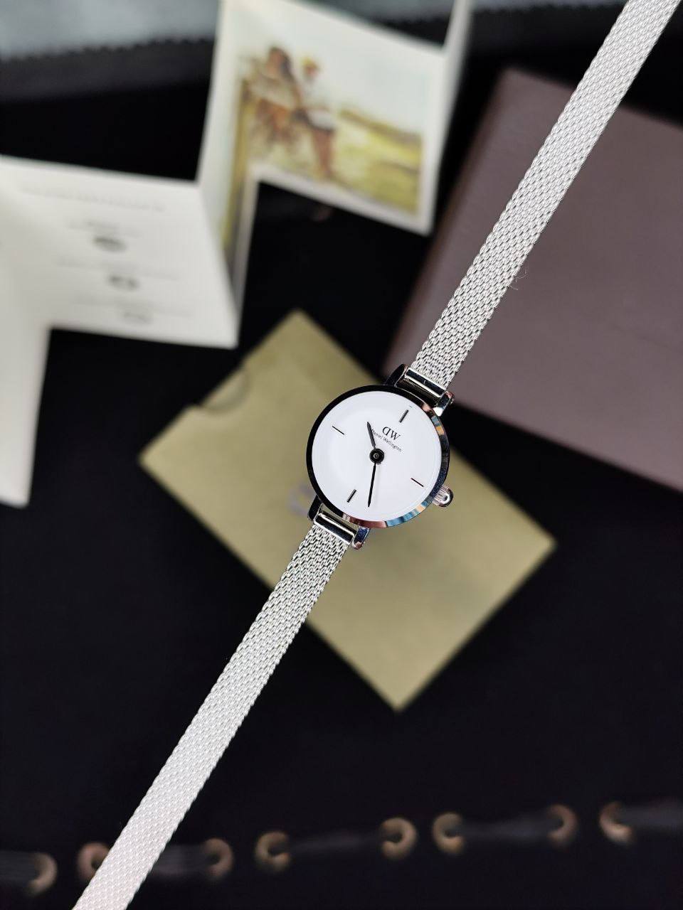 ساعت دنیل ولینگتون بند حصیری گرد بند استیل صفحه سفید ۱۵ میل