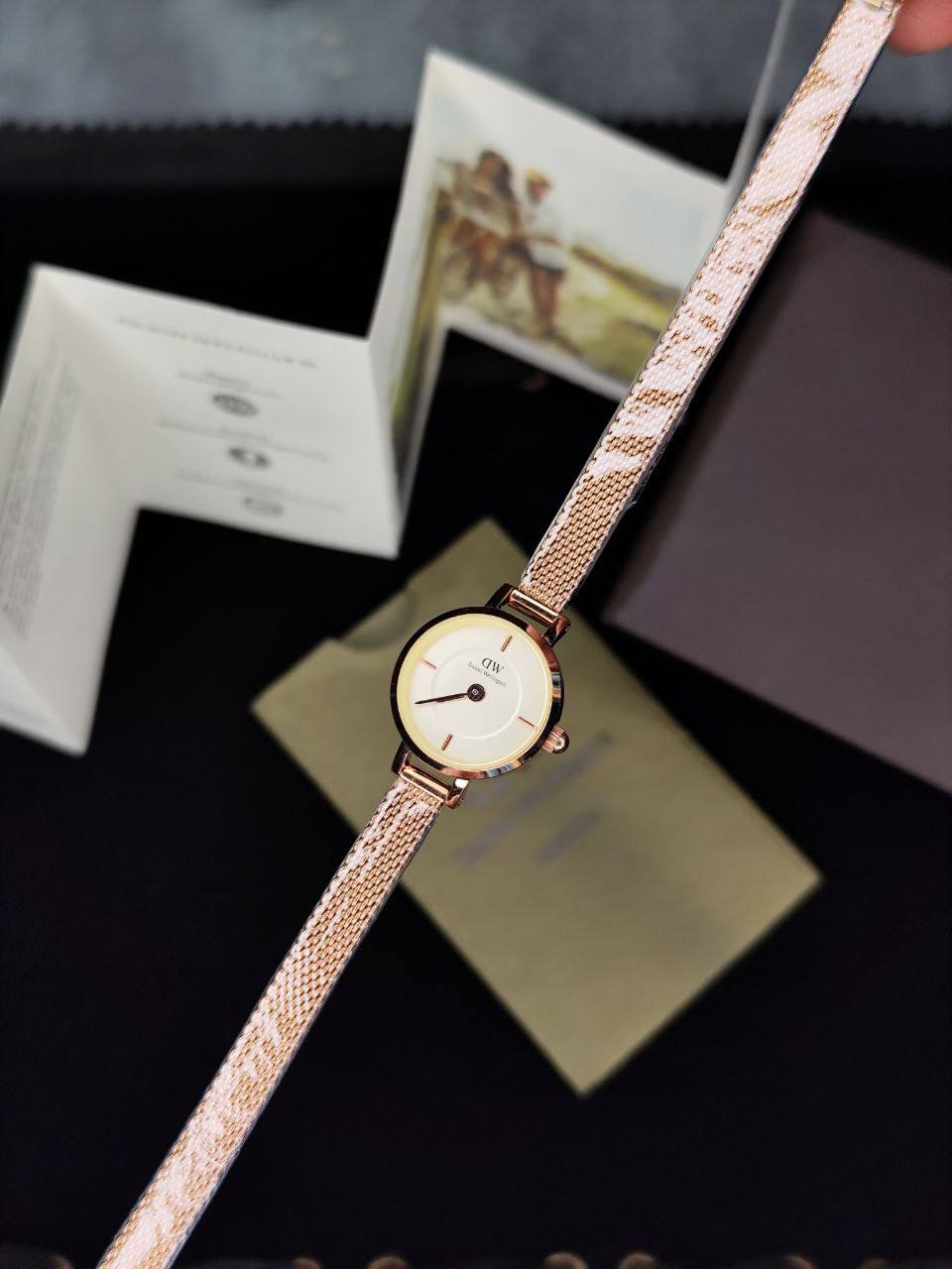 ساعت دنیل ولینگتون بند حصیری مربع رزگلد صفحه سفید ۱۵ میل